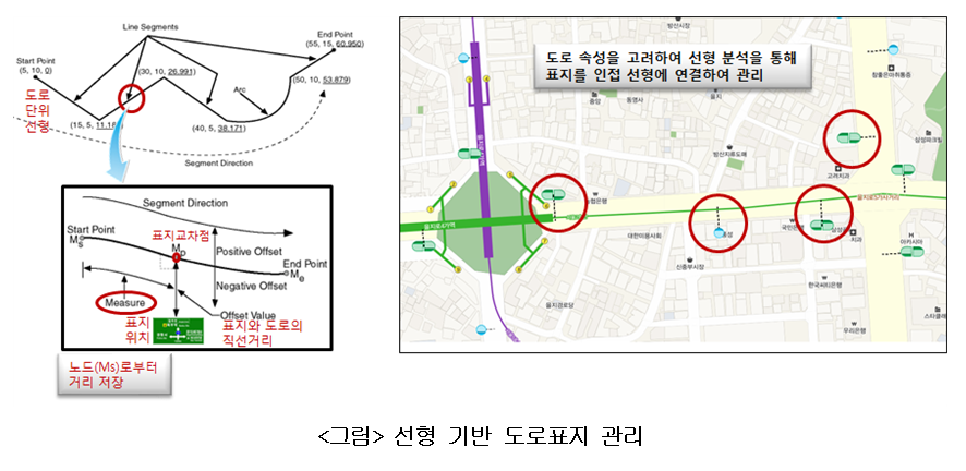 • A linear-based road sign system is a system that links all road sign data to a line (route) of the road and manages the signs on a route basis. The advantage of a linear-based system is that it automatically links all the signs to the linear information on the road, by matching consistent information from the road linear information, so it can improve error elimination & integrity and it is possible to distinguish between up-way and down-way according to the result of patch search and to ensure consistent data extraction.