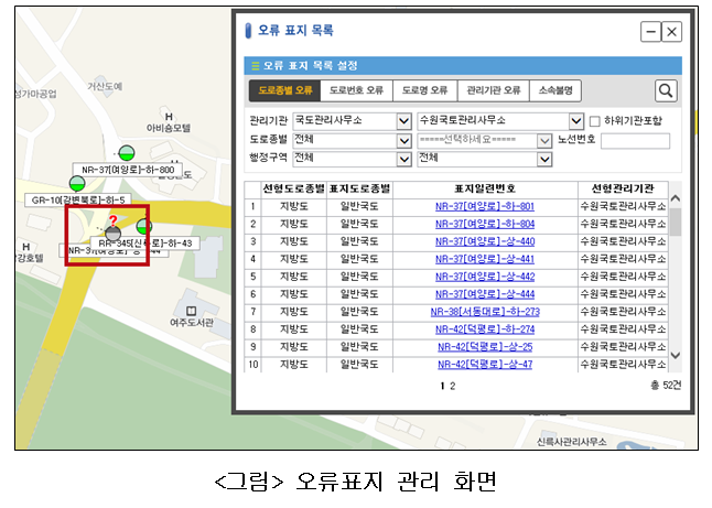 • Detection of a road sign with an error is a function that allows local staff to more granularly check the list of the road signs they manage to detect potential errors such as road type, road number, road name, management institution, unknown and so on. A wrong road sign is displayed on the screen with the combination of red question mark icons and gray icons so that they can be distinguished from existing road signs. Also users can enter the management institution, road type, route number, and administrative area as search criteria to obtain the list of road signs including errors they want and the management function of wrong road signs has been enhanced by adding the search function of a road sign with an error according to each administrative area.